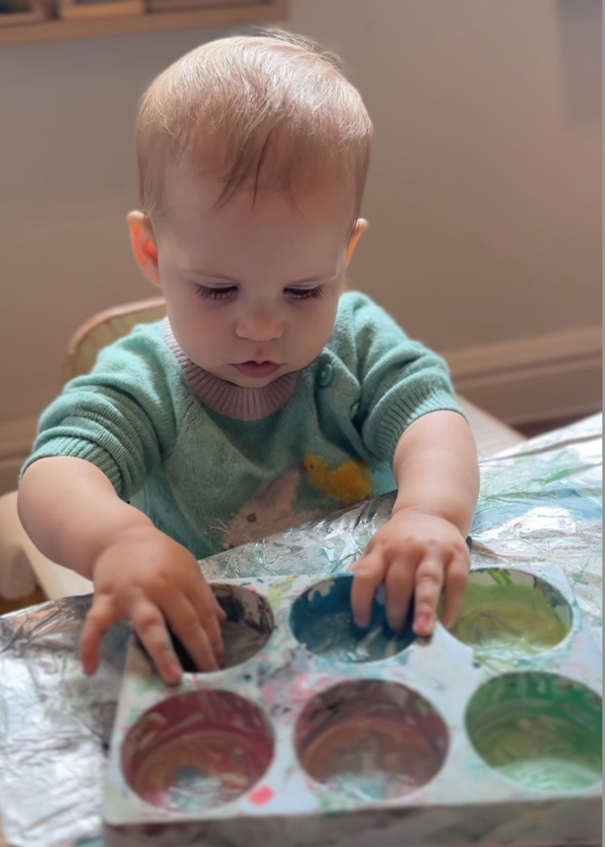 Communication and language as they babble and follow instructions and personal social emotional development through copying and exploring our sensory activity together! Resulting in a beautiful piece of art.