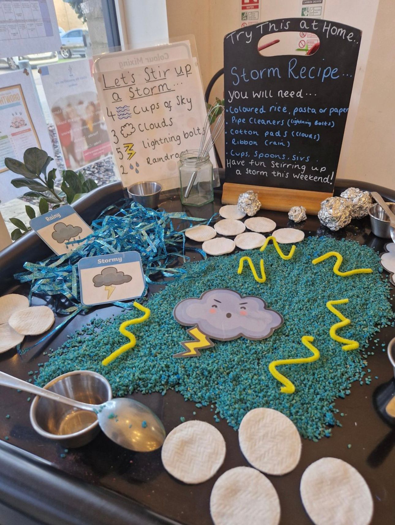 This activity is also a great way to incorporate Mathematical learning into play. Children can recognise numbers and follow the instructions on the recipe. This can be extended further with discussions of “how many” / “more or less” they are using to create their storm.