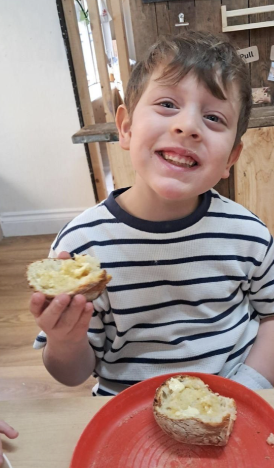This afternoon, the children participated in making bread using two ingredients—flour and natural yoghurt. They took turns adding the ingredients, with one pot of yoghurt and approximately four cups of flour. The children mixed the ingredients together. They divided the dough into seven balls, each child kneading and rolling their portion. The bread was then baked in the oven for about 20 minutes. Afterwards, the children enjoyed eating their warm, freshly made bread with butter.