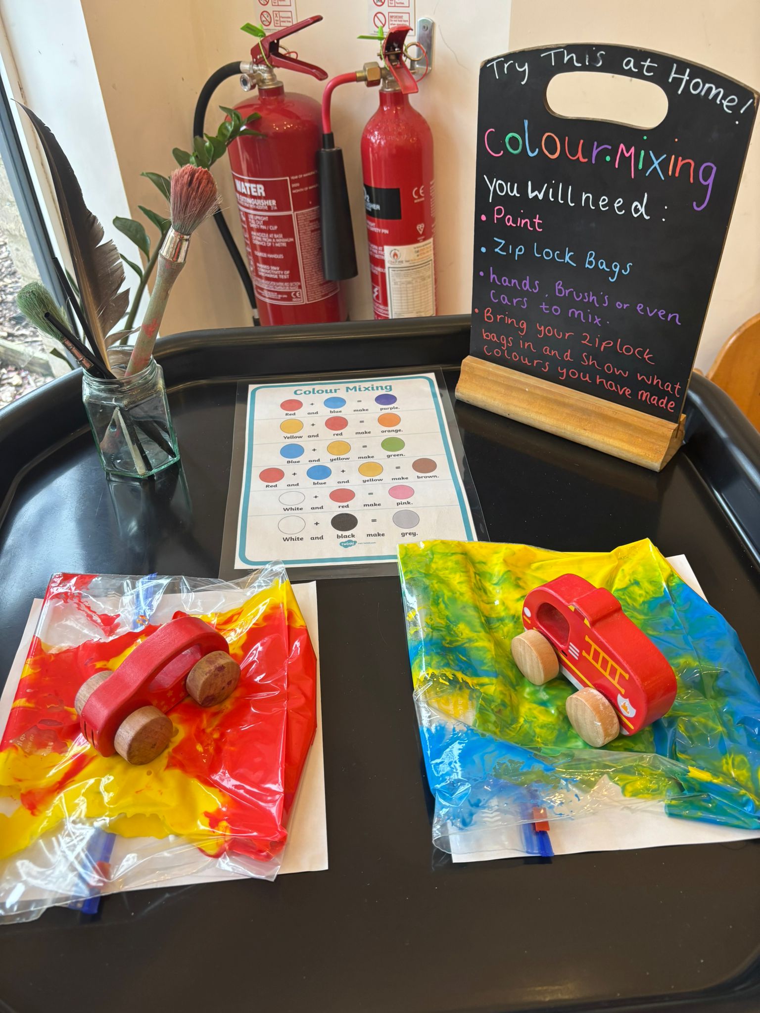 Colour mixing can help practice critical thinking skills like exploring cause and effect through observation of how colours blend together and engaging in problem solving by testing different ways to achieve a certain colour.